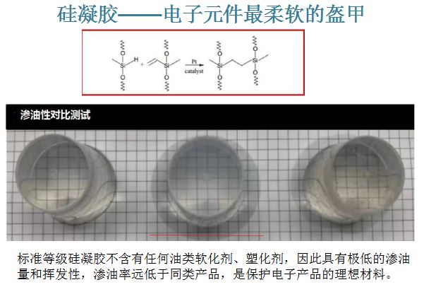 有機硅凝膠固化后是彈性膠體, 用在產品中起密封、灌封、保護 作用,在產品中能夠形成一個密 閉不透氣的密封效果。有機硅凝 膠的粘性較好,可以與金屬、 PVC等材質有效的粘合,硫化成 型之后,硅凝膠產品非常柔軟, 可以很好的封裝芯片產品,且具 備良好的耐候性,優異的化學穩 定性,耐腐蝕,可吸收熱脹冷縮 發作的應力而不會開裂,可有效 保護產品5-15年。